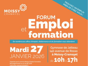 Emploi Forum emploi et formation de Moissy-Cramayel Une trentaine d’entreprises du secteur privé et public ainsi qu’une dizaine d’organismes de formation et d'accompagnement seront présents dont Cap Emploi et ACTI+, plateforme de l'UGECAM à Lieusaint. 27/01/2026 Time: 10h - 17h Gymnase de Jatteau - 140 avenue de Rosso, 77550 Moissy-Cramayel https://www.moissy-cramayel.fr Ville de Moissy-Cramayel Localiser Choice of plan Precedent Retour à la liste Suivant